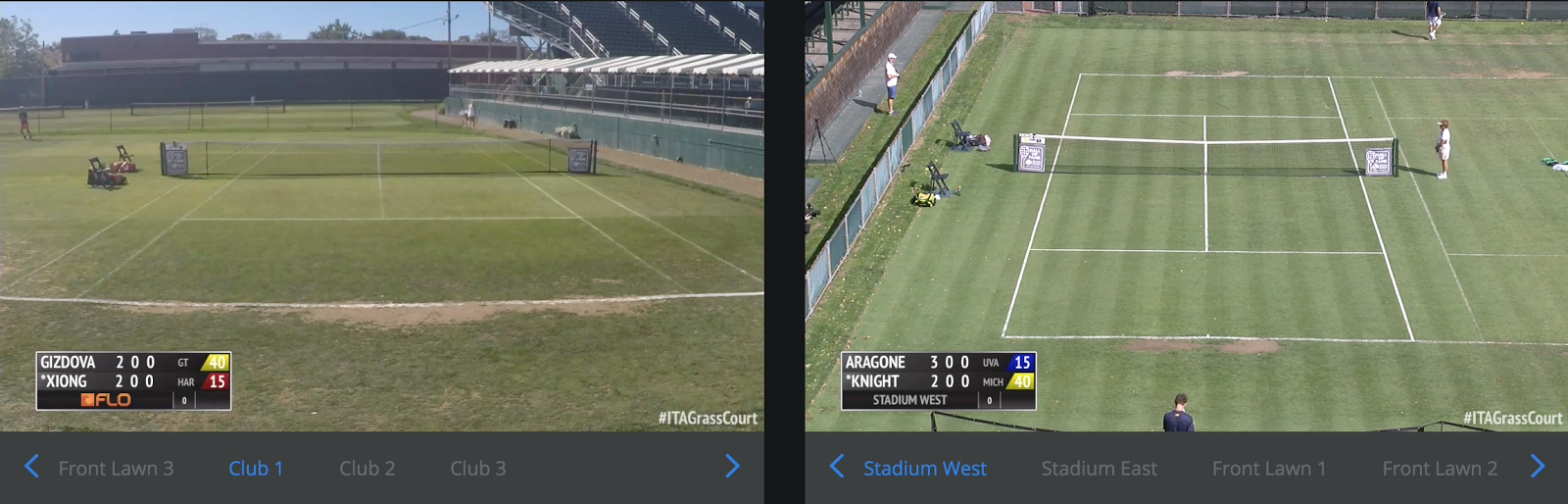 Fall tennis is in the air as players took the courts all across the country today. I was able to watch an hour or so of the inaugural Hall of Fame/ITA Grass Court Invitational on FloTennis and I liked what I saw. It was cool to see college players out on the grass courts and I liked the streaming options that FloTennis provided. They had crystal-clear live streaming on all eight courts and gave you the ability to select up to two courts at once for side-by-side viewing plus they had the score at the bottom left of the screen (see below). FloTennis didn’t have any announcers on Friday but they will on Saturday and Sunday so if you get a chance check out the broadcast for yourself at this link (subscription required).