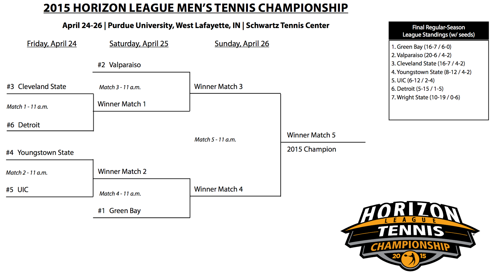 Horizon League (West Lafayette, IN) April 24-26 – Green Bay is defending champion. Participants are top 6 out of these 7: Green Bay, Youngstown St, Cleveland St, Illinois-Chicago, Wright St, Valparaiso, Detroit