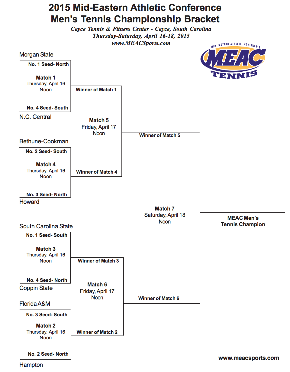 Mid Eastern Athletic Conference (MEAC) (Cayce, SC) April 16-18: South Carolina State is defending champion. Participants are top 4 in each division. Northern Division: Coppin State, Hampton, Maryland Eastern Shore, Howard, Morgan State. Southern Division: Bethune-Cookman, South Carolina St, Norfolk St, North Carolina Central, Florida A&M, North Carolina A&T.