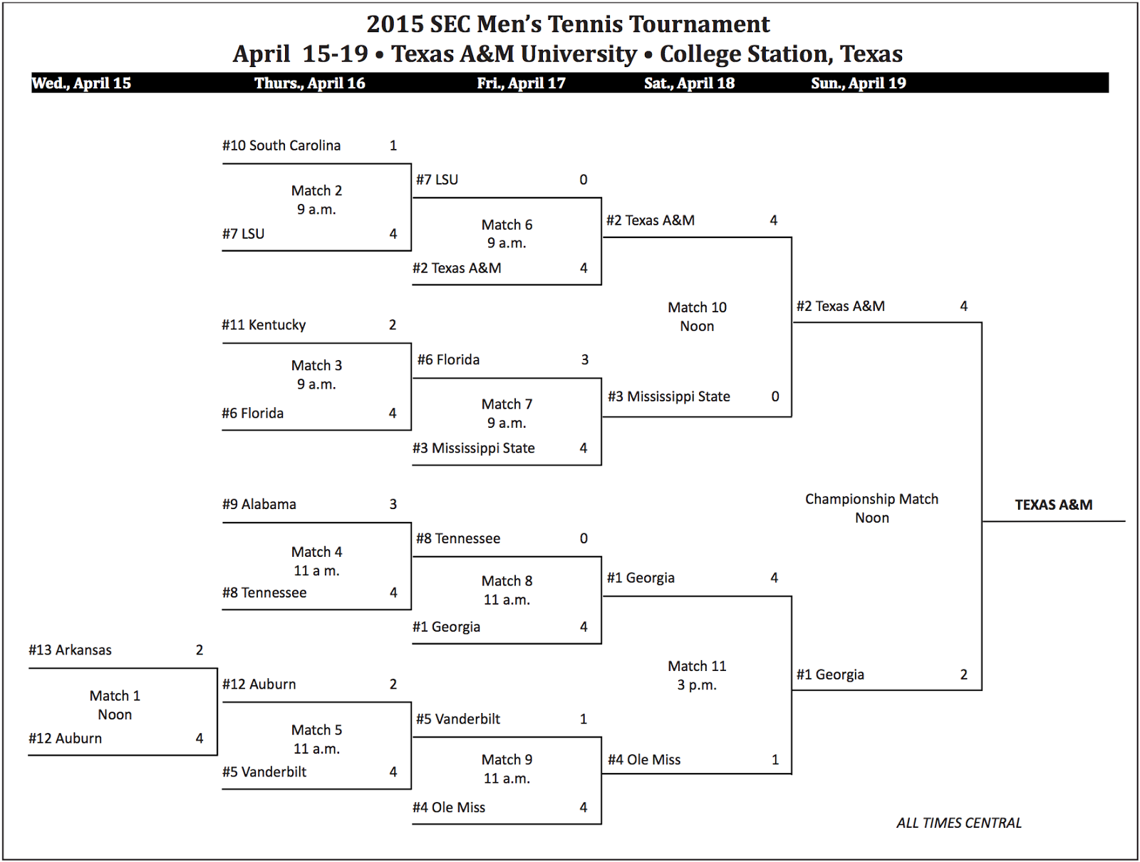 Southeastern Conference (SEC) (College Station, TX) April 15-19: Texas A&M is defending champion. Participants: Arkansas, Alabama, Auburn, Florida, Georgia, Kentucky, LSU, Ole Miss, Mississippi State, South Carolina, Tennessee, Texas A&M, Vanderbilt