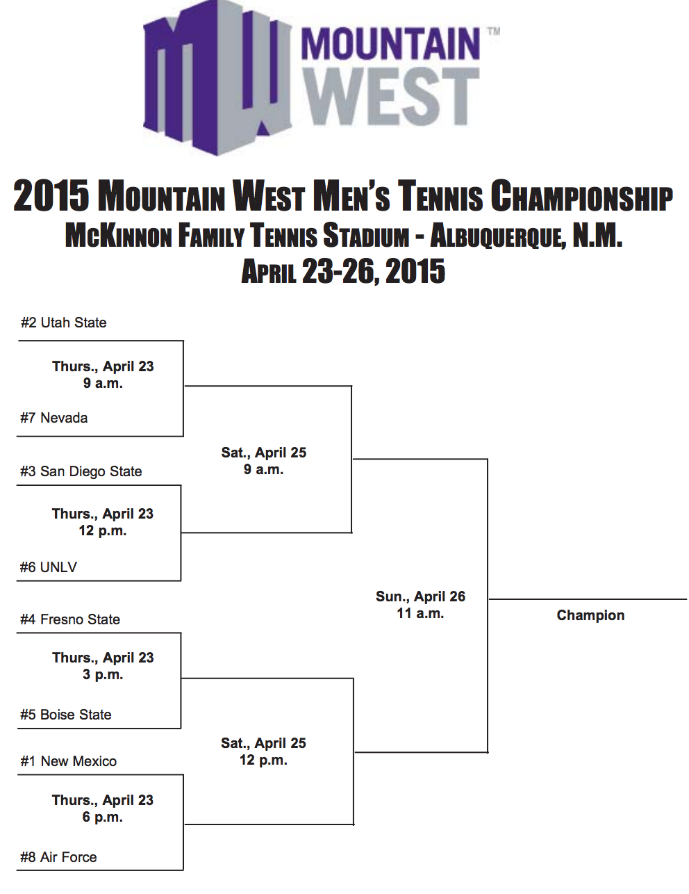Mountain West Conference (Albuquerque, NM) April 23-26 – Boise State is defending champion. Participants include Utah St, New Mexico, San Diego St, Boise St, UNLV, Fresno St, Nevada, Air Force.