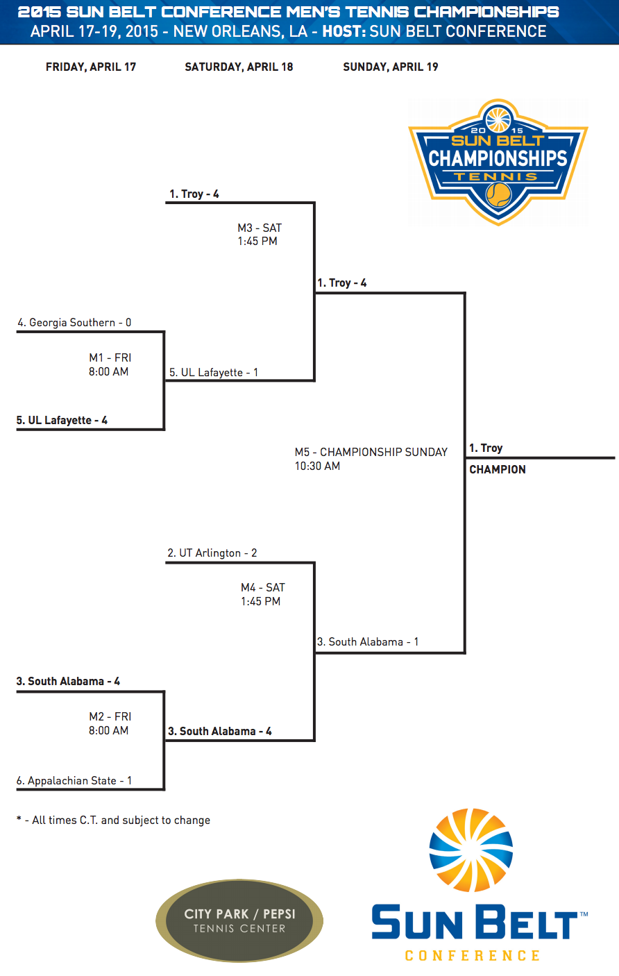 Sunbelt (New Orleans) April 17-19: Louisiana-Lafayette is defending champion. Participants: Troy, Louisiana-Lafayette, Appalachian St, Texas-Arlington, Georgia Southern, Georgia St, South Alabama.