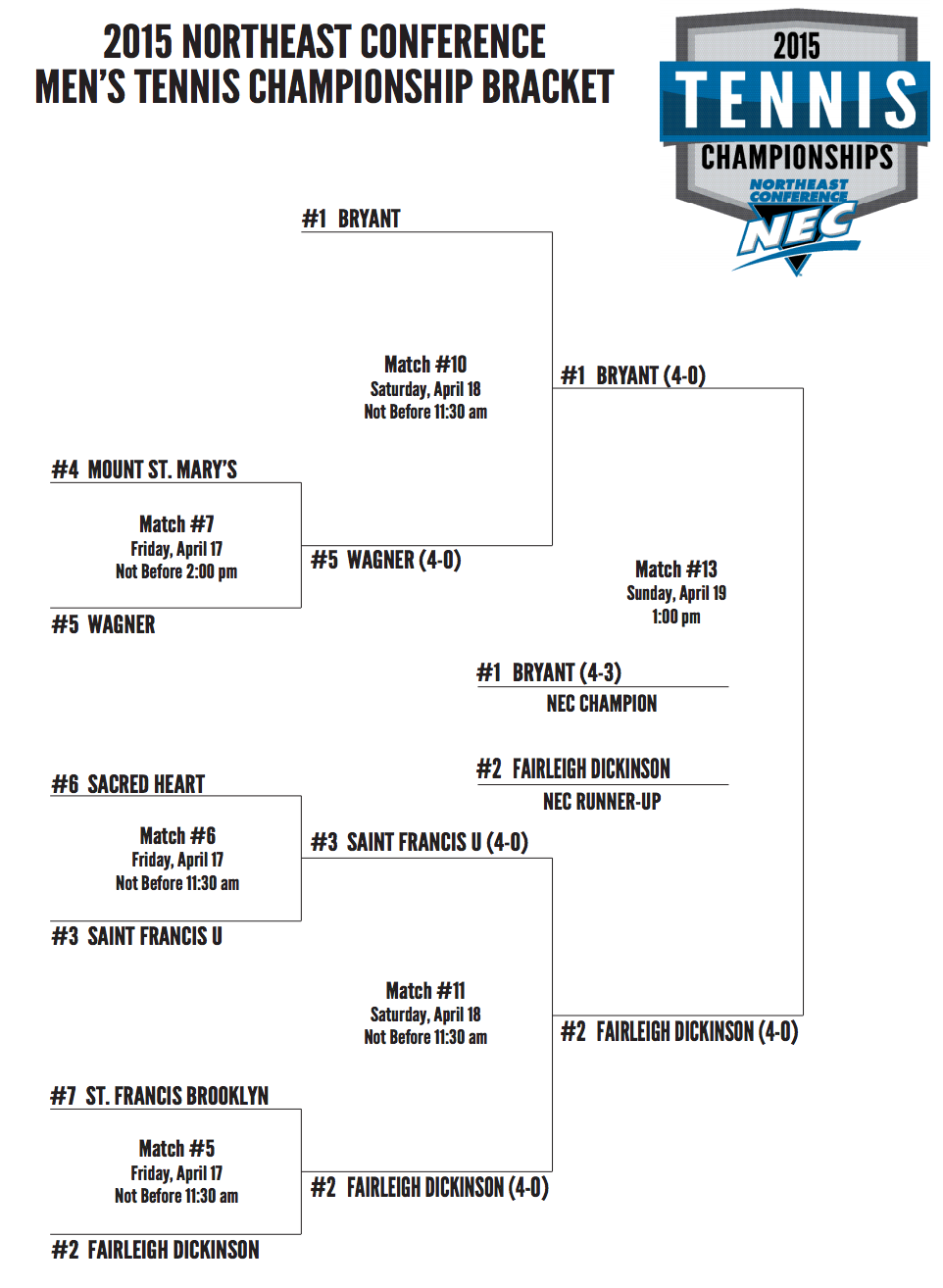 Northeast (West Windsor, NJ) April 17-19: Bryant is defending champion. Participants: Bryant, Fairleigh Dickinson, Mount St. Mary’s, Sacred Heart, St. Francis College (Brooklyn), St. Francis U, Wagner.