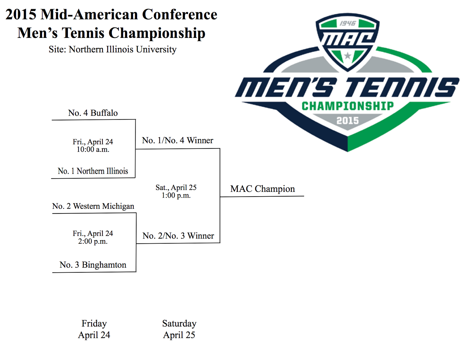Mid-American Conference (MAC) (DeKalb, IL) April 24-25 – Ball State is defending champion. Participants are top 4 out of these 6: Northern Illinois, Western Michigan, Binghamton, Toledo, Ball St, Buffalo.